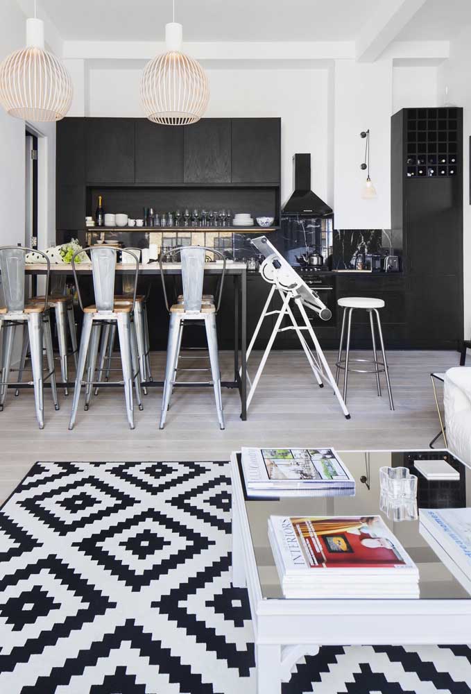 Imagem 30 – A sala de jantar ganhou a companhia de um enorme tapete geométrico preto e branco.
