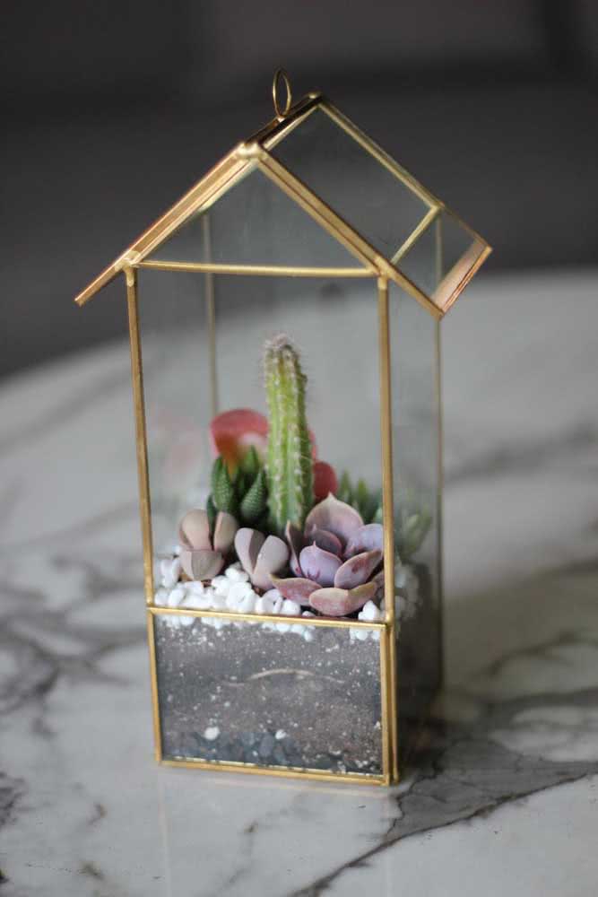 Imagem 16 – Terrário de suculentas aberto com toque de dourado.