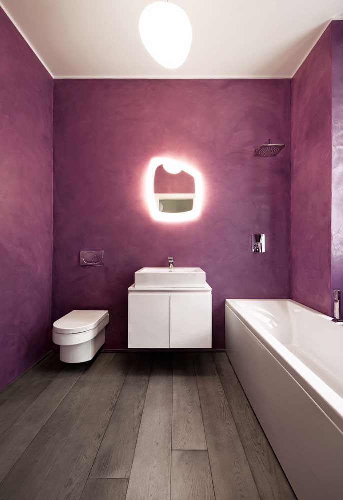 Imagem 9 – O que acha de fazer um banheiro roxo para sua casa? Para isso, use a cor diretamente na parede do cômodo.