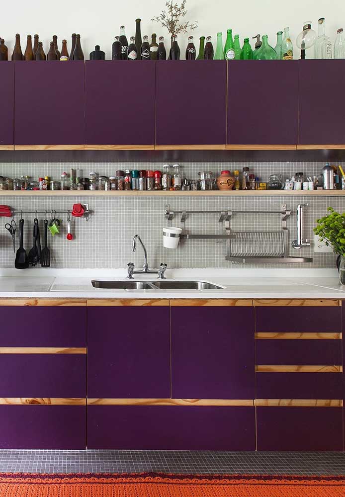 Imagem 40 – Já pensou em apostar na cor roxa para fazer os armários da sua cozinha?