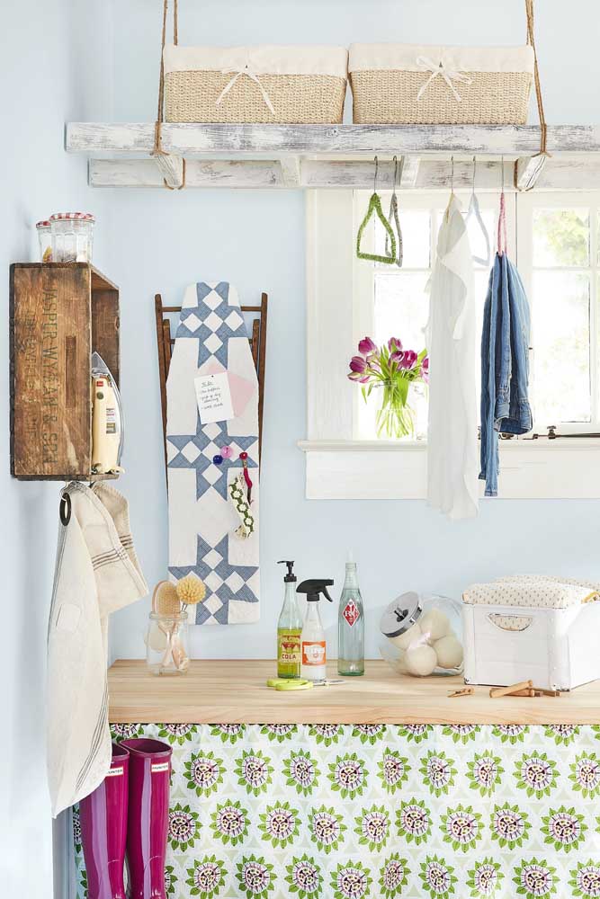 Imagem 10 – Área de serviço upcycling: tudo aqui integra esse conceito, do suporte feito com escada ao porta recados na tábua de passar.
