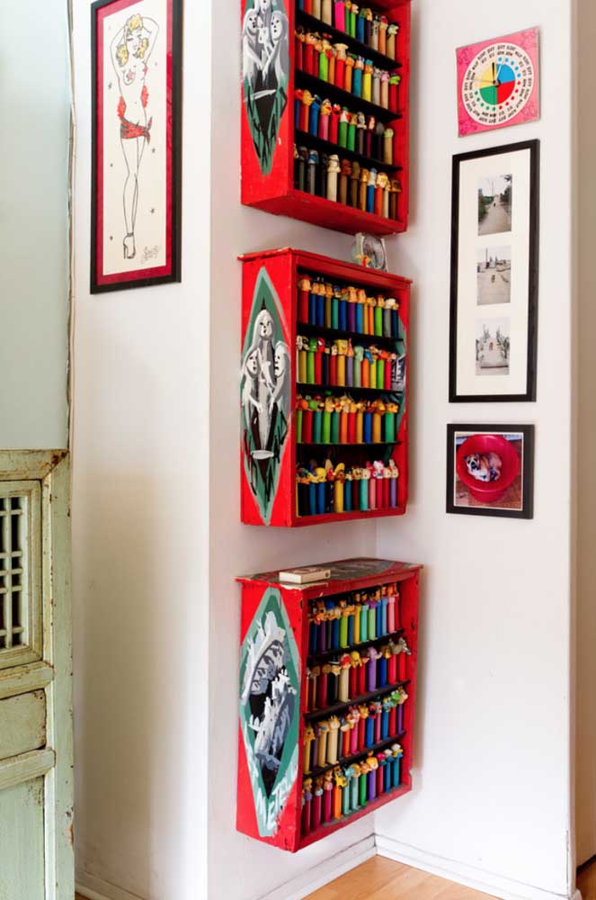 Imagem 16 – Aqui, os caixotes de madeira pintados de vermelho se tornaram ótimos expositores para a coleção de bonecos.