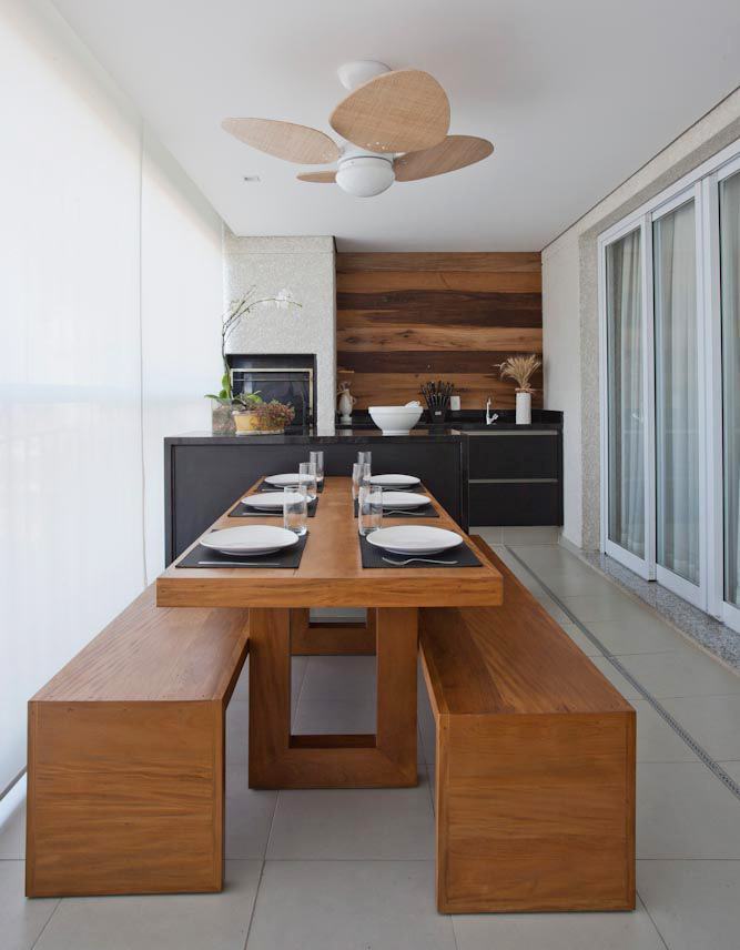 Imagem 45 – Utilize cadeiras em uma lateral da mesa e o banco na outra, além de moderno leva versatilidade na varanda
