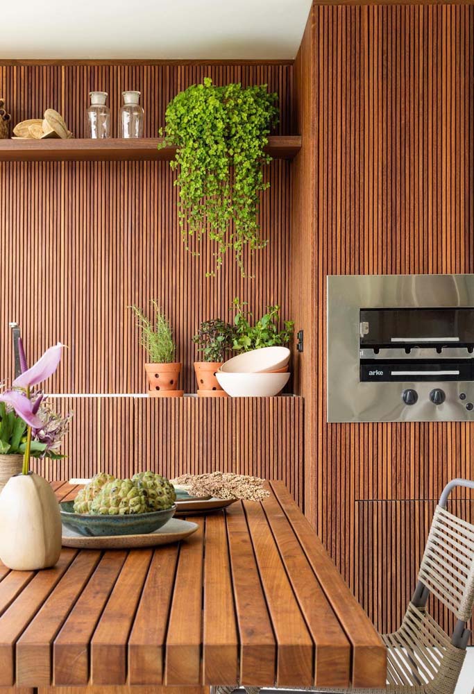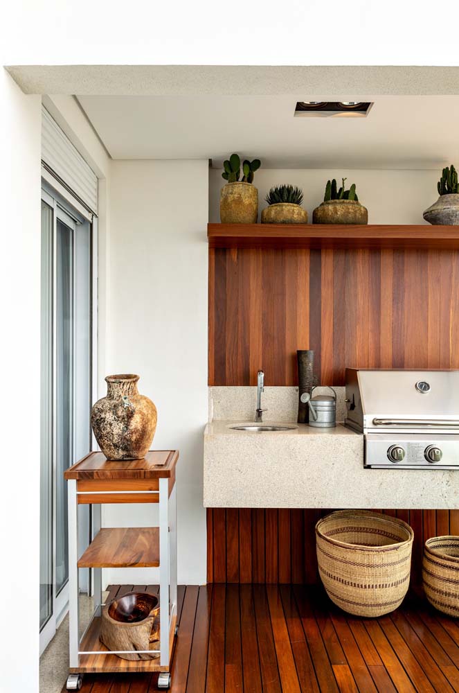 Imagem 24 – Use madeira para “aquecer” a varanda gourmet com churrasqueira