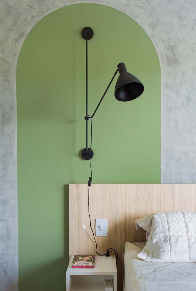 Imagem 30 – Aqui, a dica é usar uma mesinha de cabeceira verde em contraste com a cabeceira cinza.