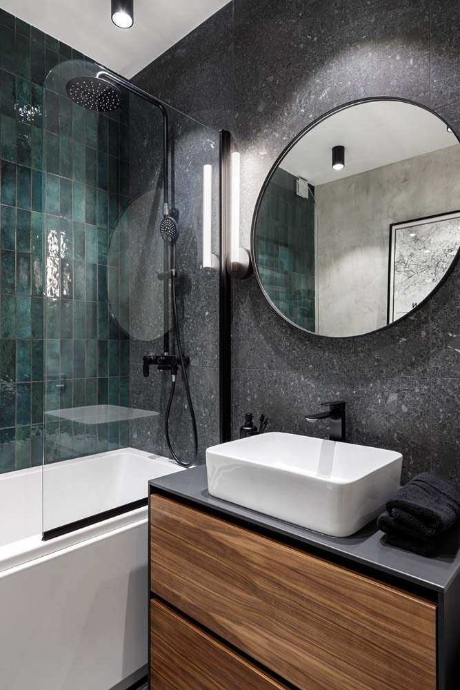 Imagem 9 – Banheiro verde e cinza moderno com toque de preto nos detalhes.