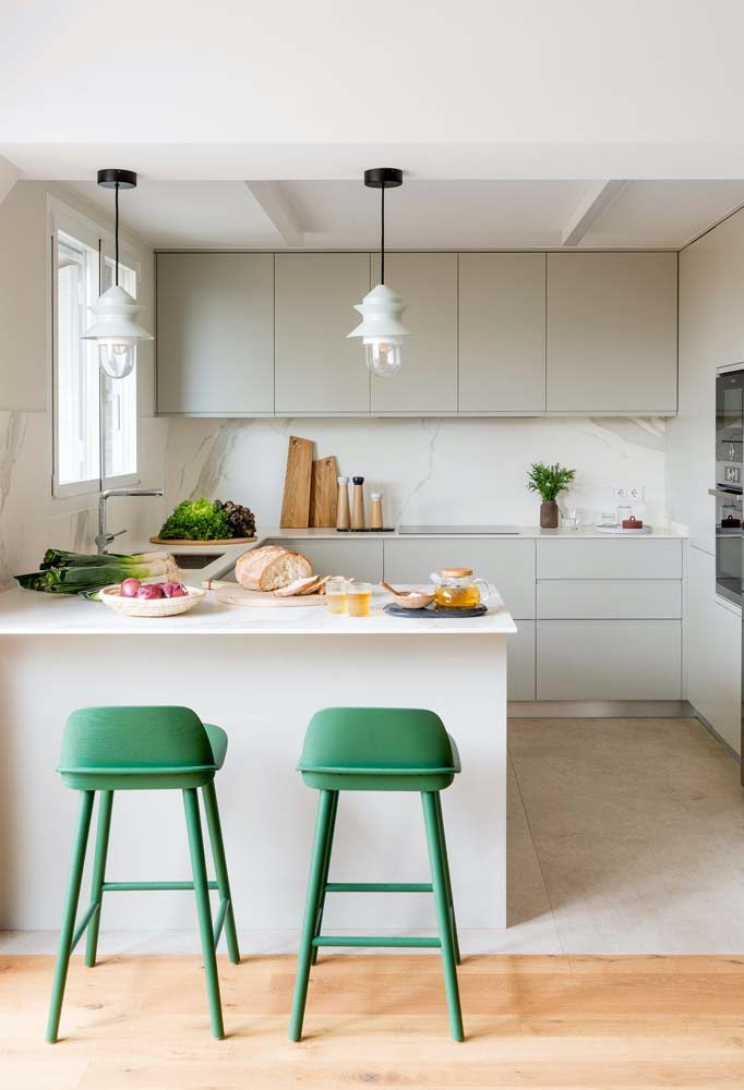 Imagem 50 – O simples vale muito! Nessa cozinha, bastaram duas banquetas verdes