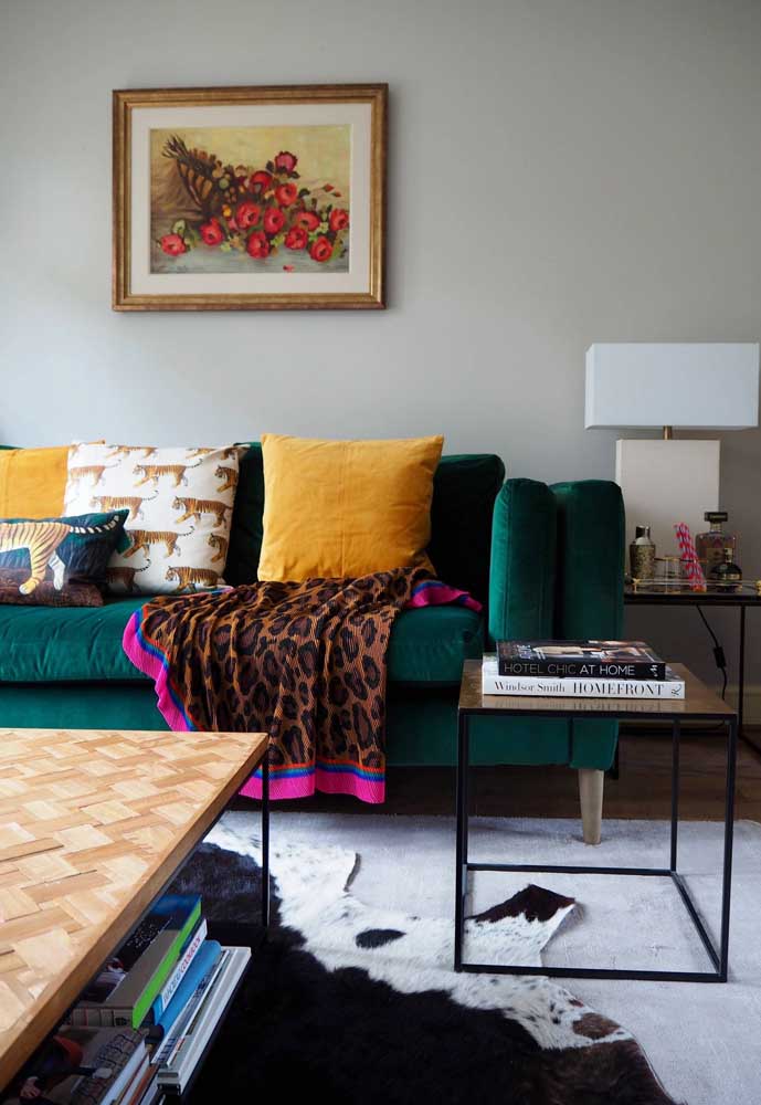 Imagem 30 – Parede verde esmeralda combinando com o pufe e a manta da mesma cor.